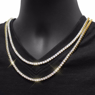 Bling Iced Tennis Necklace Chain Mens Womens 14k White Gold 5X Layered 4mm thick 16- 24inch choker Life warranty Doesnt Turn Neck Green. The gold 4mm Tennis Chain is fully iced-out with handset lab simulated CZ stones and a secure box clasp. Tennis Leagues in Springfield New Jersey.